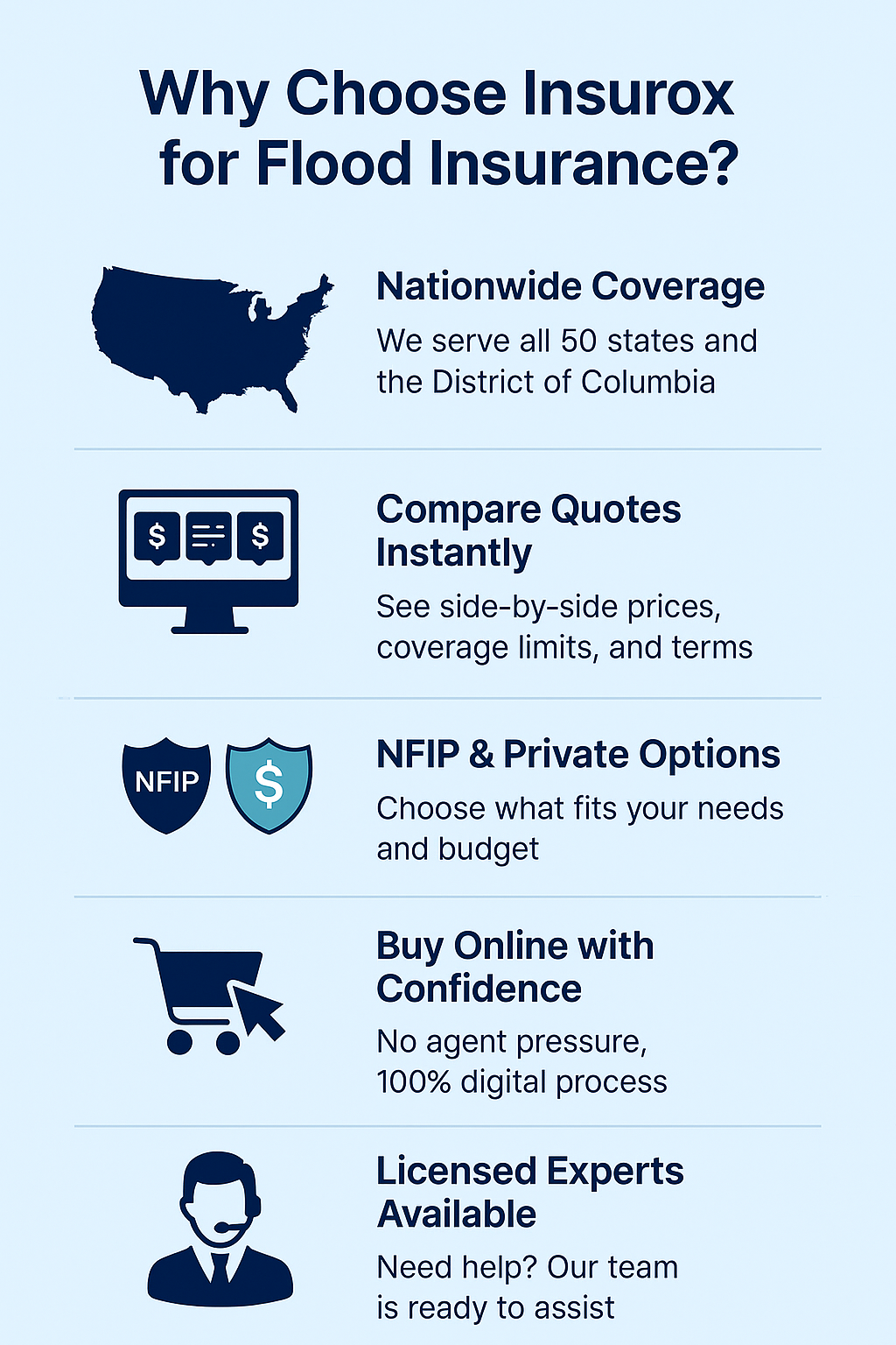 Why Choose Insurox? Compare flood insurance quotes instantly, access coverage in all 50 states, and buy online with support from licensed experts.